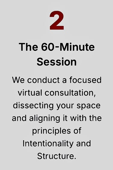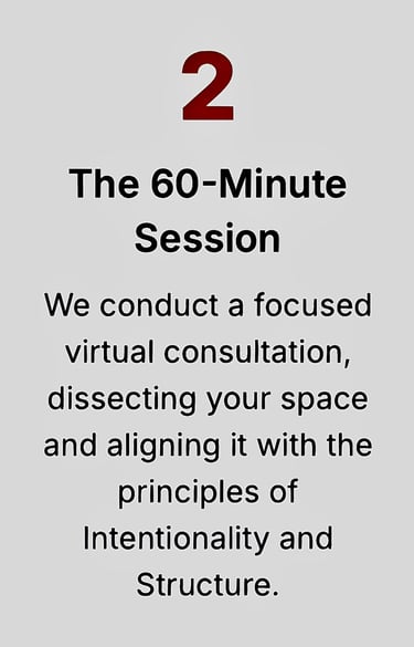 This 60-minute intensive is your first step toward Masterful Stewardship of your environment. It's a structured assessment designed to identify the exact friction points between your space and your lifestyle.